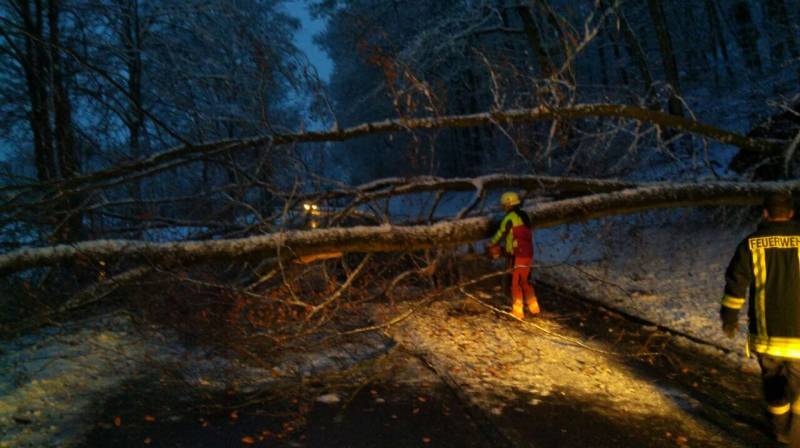 Durch den starken Schneefall war gleich mehrere Bäume auf die Fahrbahn gestürzt. Sie wurden mit einer Motorsäge zerkleinert und beseitigt.